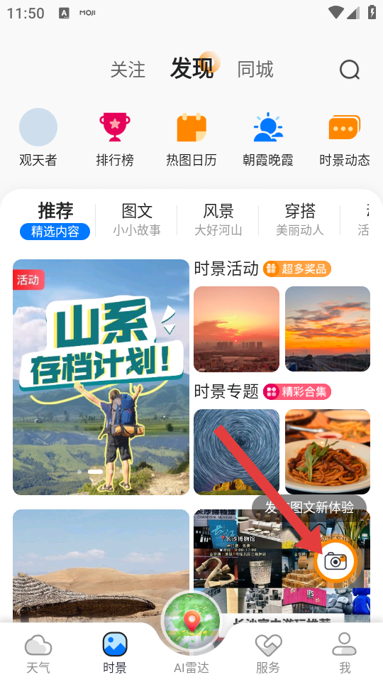 1、打開墨跡天氣APP,切換到時(shí)景頁面,點(diǎn)擊右下角相機(jī)圖標(biāo),彈出操作選項(xiàng)菜單,開啟實(shí)景照片上傳流程。
