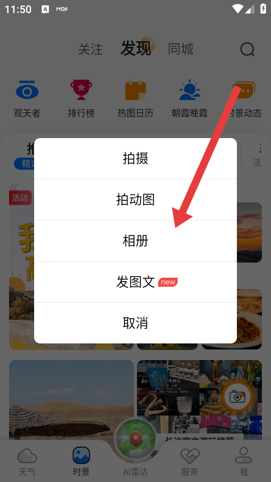 2、在彈出的選項(xiàng)中,這里我們選擇相冊(cè),也可按需選拍攝/拍動(dòng)圖,進(jìn)入手機(jī)相冊(cè)選取要上傳的實(shí)景照片。