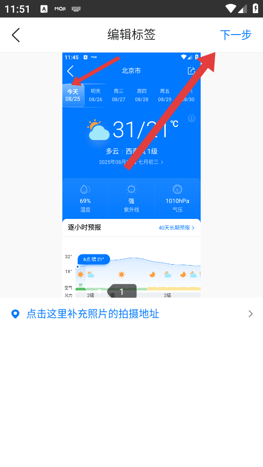 3、進(jìn)入編輯標(biāo)簽頁面,可補(bǔ)充拍攝地址等信息,確認(rèn)后點(diǎn)擊右上角下一步,完成實(shí)景照片上傳操作。