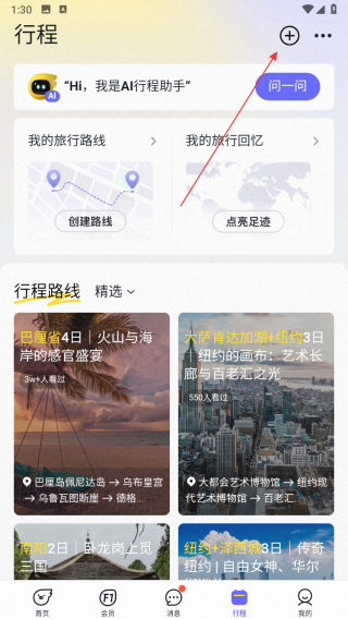 1、打開飛豬旅行APP,點(diǎn)在行程頁面右上角,點(diǎn)擊+號(hào)圖標(biāo)。