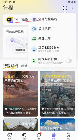 2、點(diǎn)擊之后會(huì)展開操作的選項(xiàng),選擇創(chuàng)建行程路線這一選項(xiàng)。