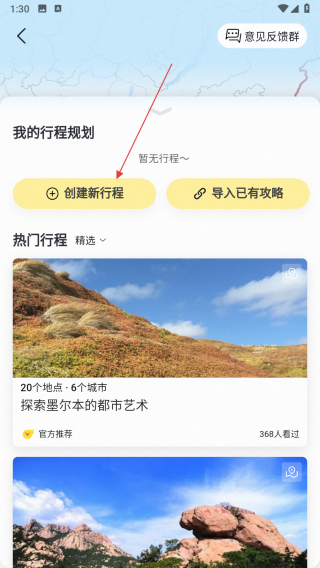 3、進(jìn)入行程創(chuàng)建頁面后,點(diǎn)擊創(chuàng)建新行程按鈕。