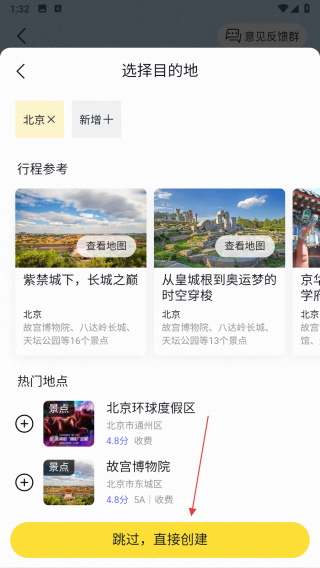 4、在選擇目的地頁面,可選擇目的地或直接點(diǎn)擊跳過,直接創(chuàng)建,隨后按提示填寫行程信息,完成新行程的創(chuàng)建。