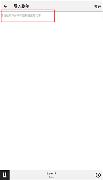 3.提前在歌單分享功能中復制好歌單鏈接,最后在【導入歌單】頁面中,粘貼到框框中,點擊右上角的“打開”即可導入成功。