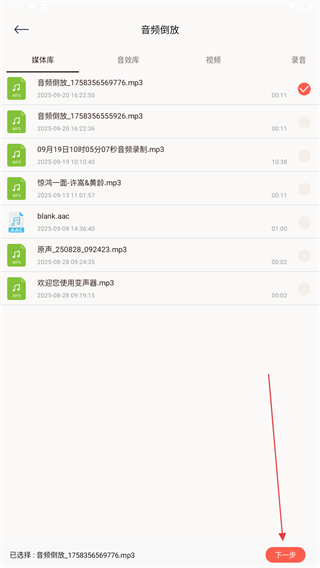 3、在倒放的頁面內,選擇并勾選視頻后點擊右下角下一步的按鈕。