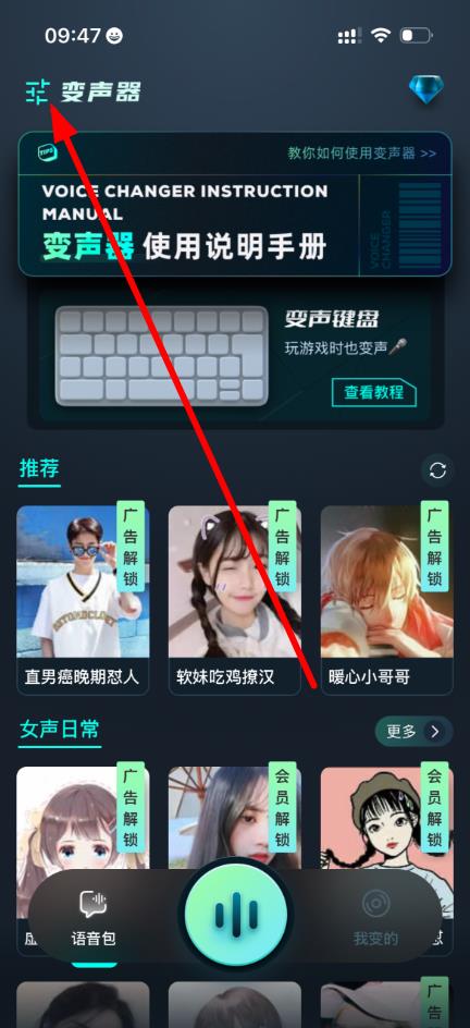 1、打開(kāi)變聲器應(yīng)用,在主界面點(diǎn)擊左上角的變聲器標(biāo)識(shí)。