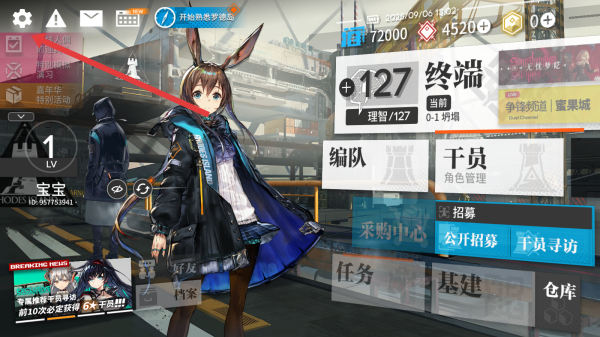1、打開明日方舟游戲,點(diǎn)擊主界面左上角的設(shè)置圖標(biāo)進(jìn)入設(shè)置頁面。