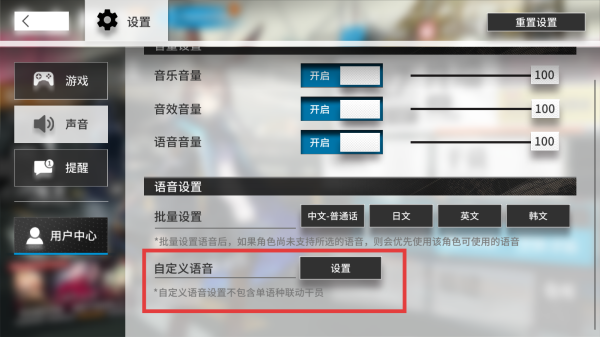 3、聲音設(shè)置界面的語音設(shè)置板塊,找到自定義語音選項(xiàng)并點(diǎn)擊設(shè)置按鈕。