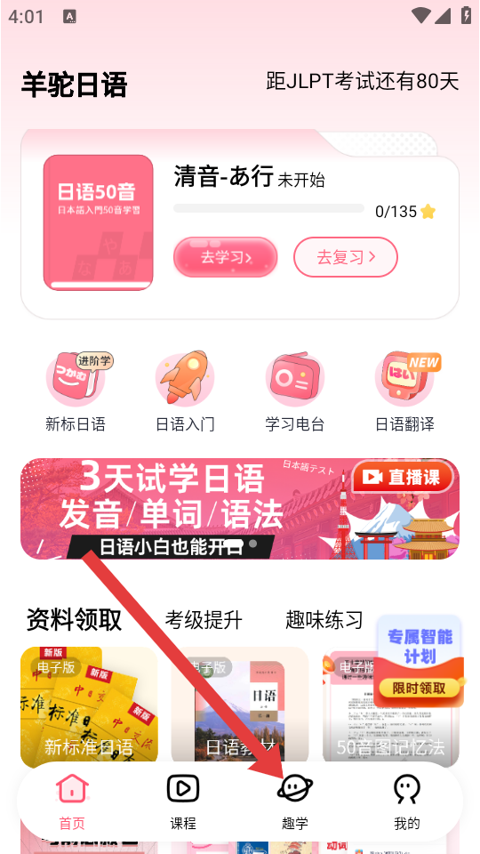 1、打開羊駝日語APP首頁,點擊底部趣學(xué),進(jìn)入趣味學(xué)習(xí)頁面。