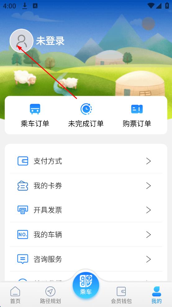 1、打開青城地鐵應(yīng)用,進(jìn)入“我的”頁面,點擊上方“未登錄”頭像區(qū)域,跳轉(zhuǎn)至登錄界面 。