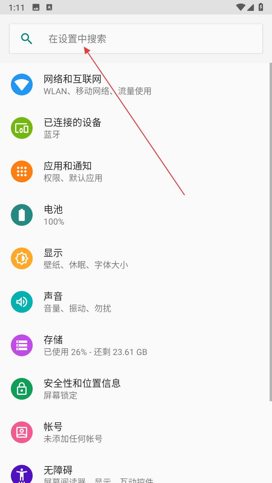 1、打開手機(jī)設(shè)置界面,點擊頂部在設(shè)置中搜索框。