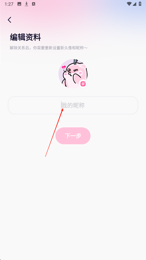 1、進(jìn)入戀愛(ài)記編輯資料頁(yè)面,點(diǎn)擊頭像可更換新頭像,再點(diǎn)擊我的昵稱輸入框,輸入想要設(shè)置的昵稱,完成后點(diǎn)擊下一步。