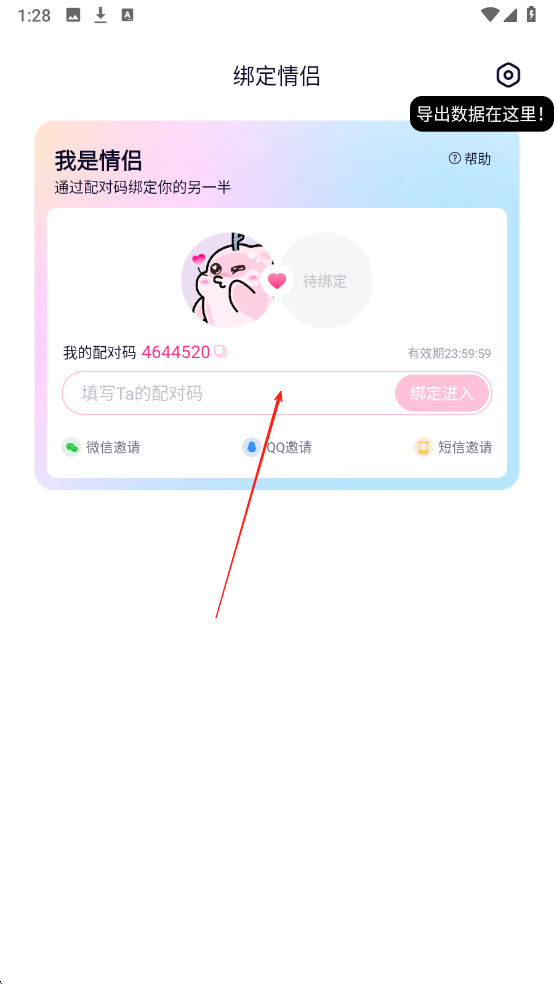 2、來(lái)到綁定情侶頁(yè)面,若要邀請(qǐng)另一半,先讓其下載并注冊(cè)戀愛(ài)記,待對(duì)方注冊(cè)成功,獲取其頁(yè)面的配對(duì)碼,在填寫Ta的配對(duì)碼輸入框中填入該配對(duì)碼,隨后點(diǎn)擊綁定進(jìn)入。