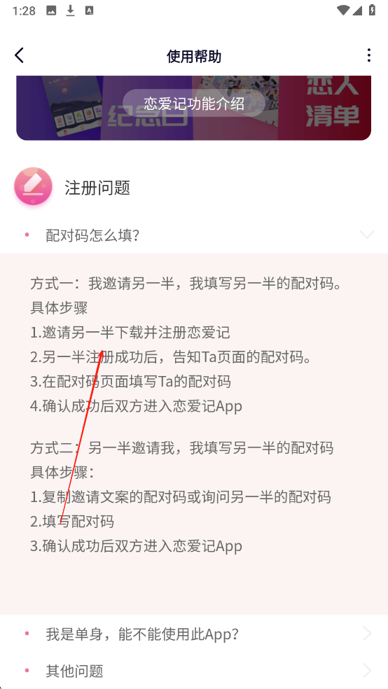 3、要是另一半邀請(qǐng)自己,復(fù)制邀請(qǐng)文案里的配對(duì)碼,或者詢問(wèn)另一半獲取配對(duì)碼,將其填寫到填寫Ta的配對(duì)碼輸入框,點(diǎn)擊綁定進(jìn)入,確認(rèn)成功后雙方就能進(jìn)入戀愛(ài)記App。