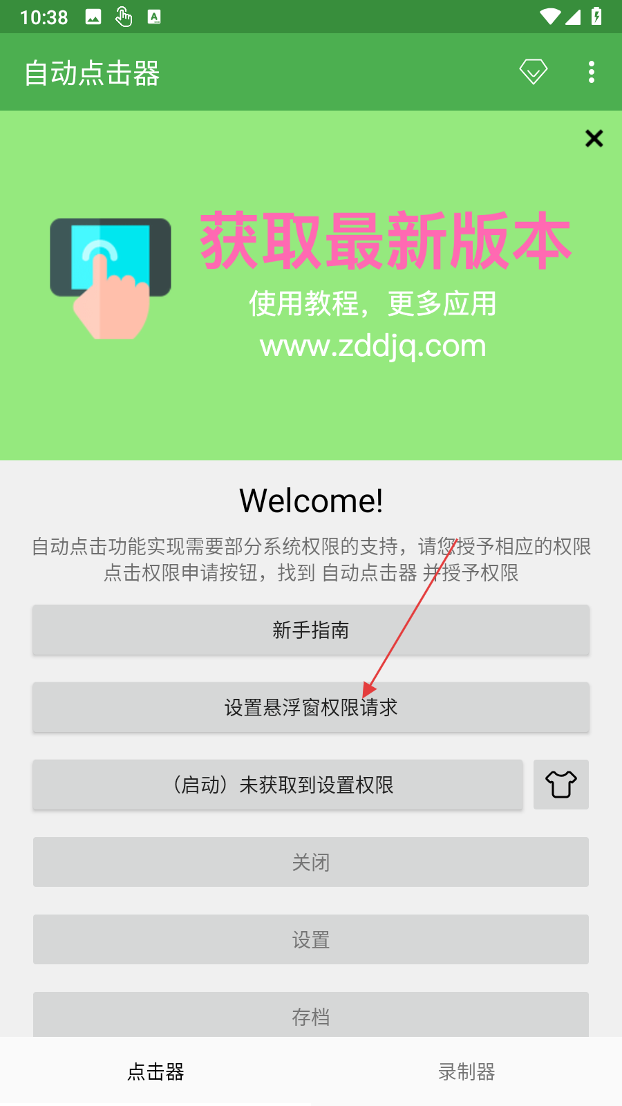 1、打開自動點(diǎn)擊器,點(diǎn)擊設(shè)置懸浮窗權(quán)限請求,進(jìn)入手機(jī)顯示在其他應(yīng)用的上層設(shè)置頁面。