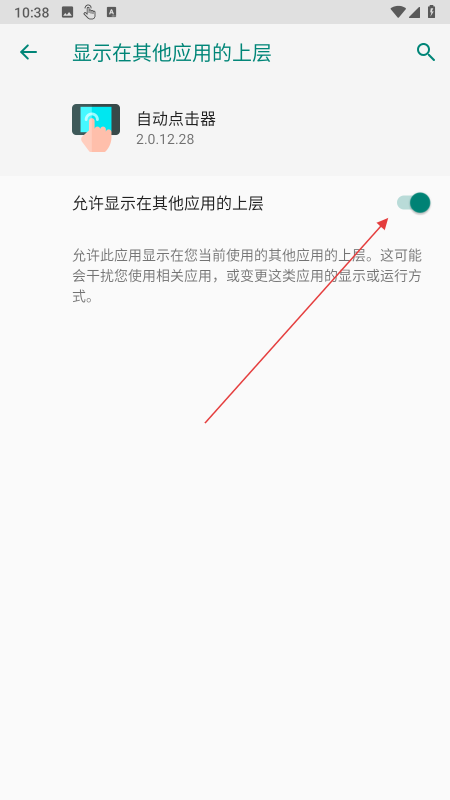 2、在顯示在其他應(yīng)用的上層設(shè)置頁面,找到自動點(diǎn)擊器,開啟允許顯示在其他應(yīng)用的上層開關(guān)。