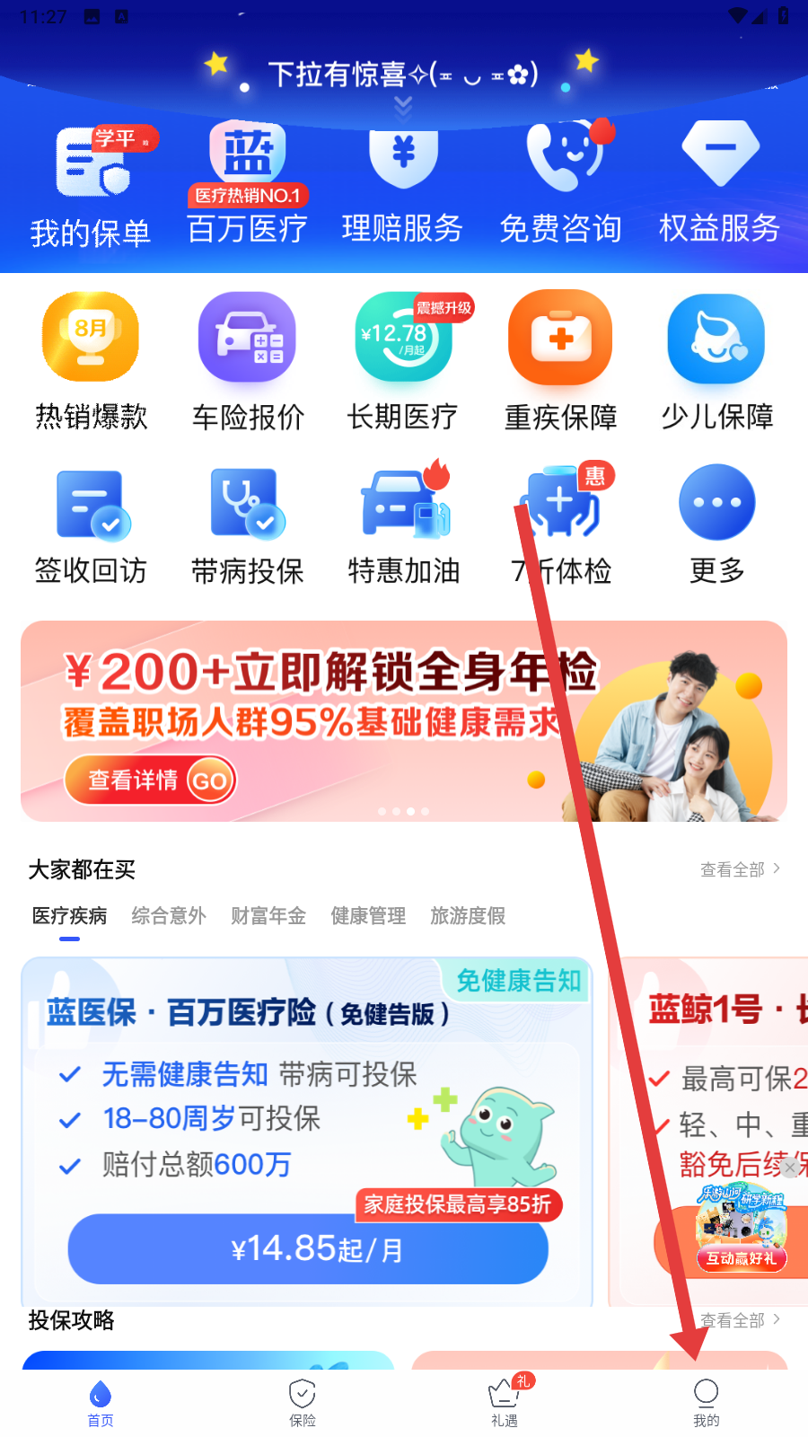 1、在太平洋保險首頁中,可以點擊右下角我的按鈕,進入到我的主頁中。