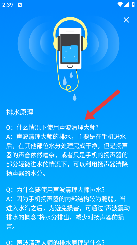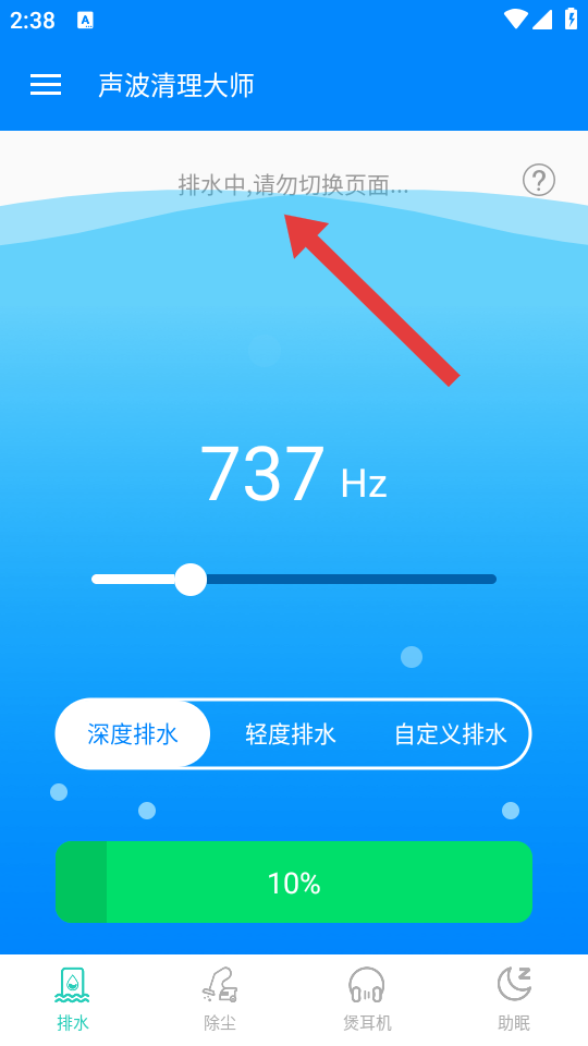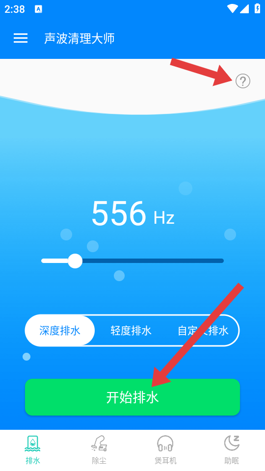1、在聲波清理大師主界面,先點(diǎn)擊右上角?圖標(biāo),可查看排水原理,隨后點(diǎn)擊開(kāi)始排水按鈕。