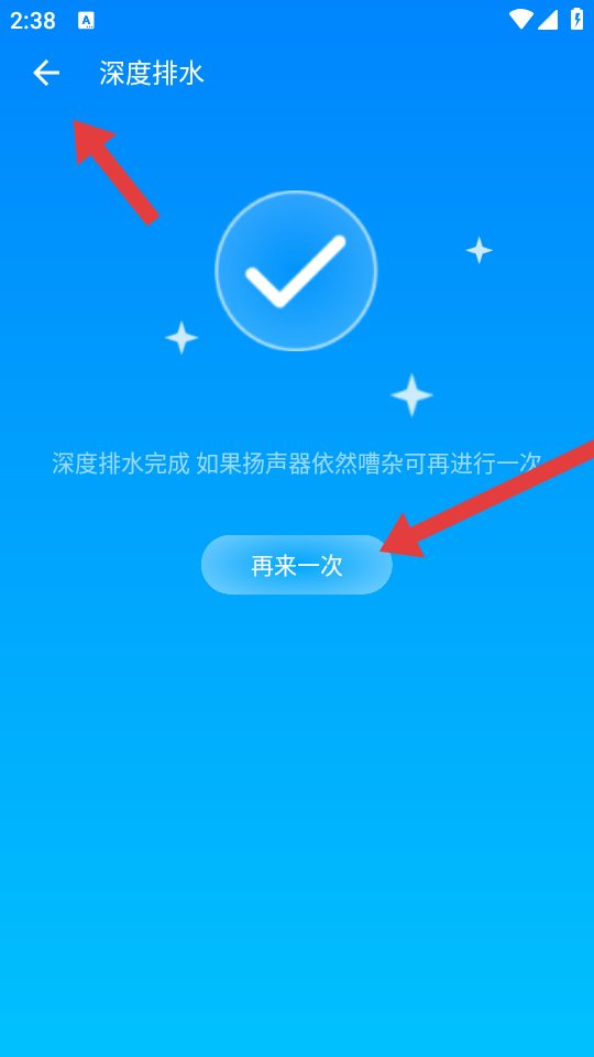 4、排水完成后,若揚(yáng)聲器仍有雜音,可點(diǎn)擊再來(lái)一次,也可點(diǎn)擊返回箭頭,退出排水界面。