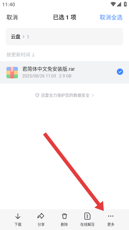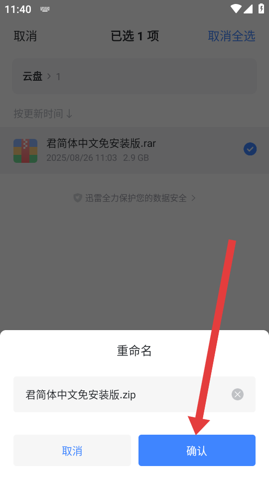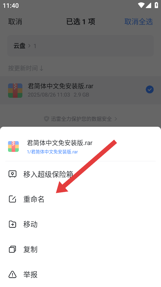 1、打開(kāi)迅雷APP,進(jìn)入云盤(pán)頁(yè)面,找到并長(zhǎng)按要修改格式的文件如君簡(jiǎn)體中文免安裝版.rar將其選中。