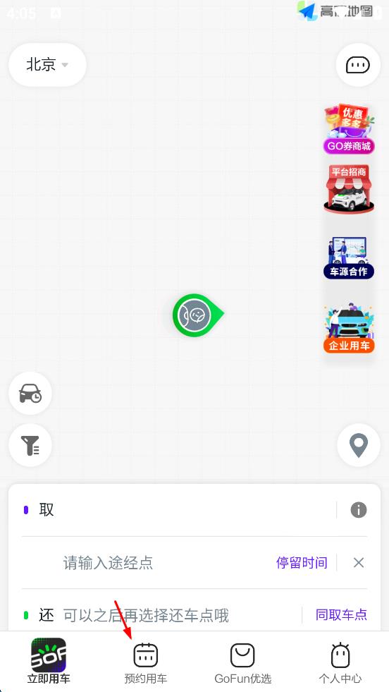 1、打開GoFun出行軟件,在首頁底部功能選項(xiàng)中找到“預(yù)約用車”選項(xiàng)并點(diǎn)擊,進(jìn)入預(yù)約用車頁面,設(shè)置取車城市、取車地點(diǎn)以及用車時(shí)間等信息。
