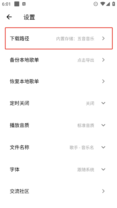 5、在設(shè)置中可以看到下載路徑,將會(huì)看到現(xiàn)在的下載音樂位置所在位置;