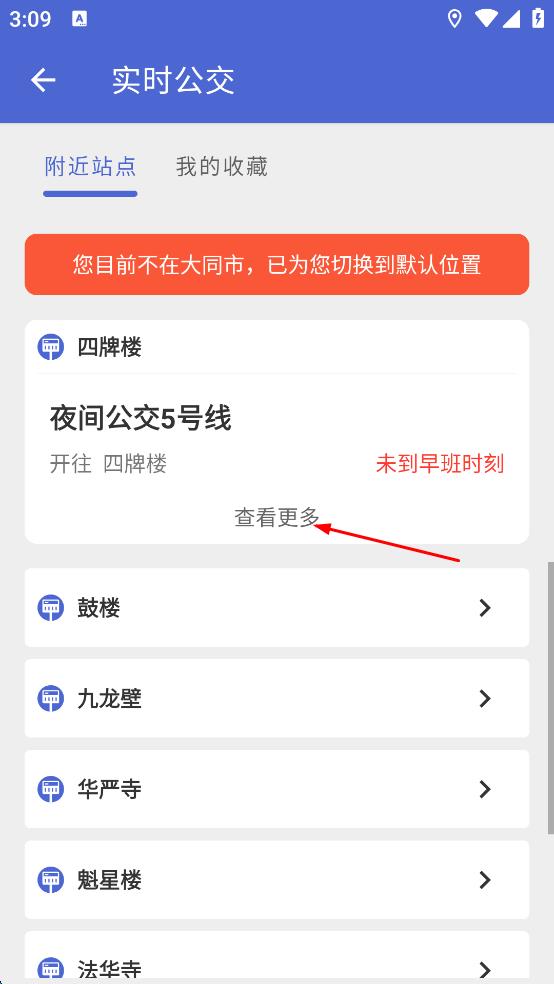 2、在實(shí)時(shí)公交的附近站點(diǎn)欄,找到想了解的線路,點(diǎn)擊查看更多,獲取該線路詳細(xì)站點(diǎn)動(dòng)態(tài)。