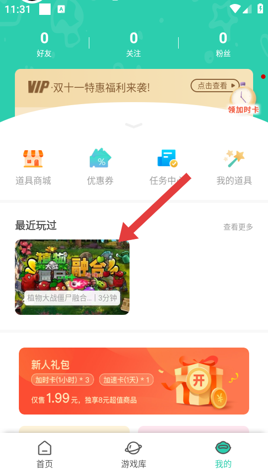1、打開(kāi)餃子云游戲APP,在我的頁(yè)面最近玩過(guò)區(qū)域找到目標(biāo)游戲如植物大戰(zhàn)僵尸融合版,點(diǎn)擊進(jìn)入游戲詳情頁(yè)面。