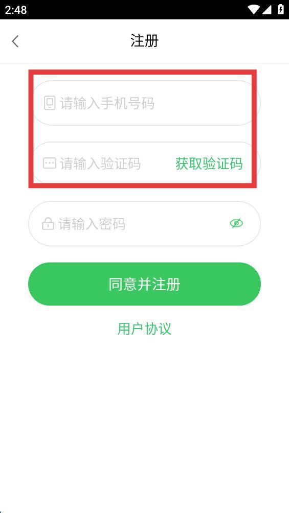 2、在注冊界面的輸入框中填寫手機號和收到的驗證碼。