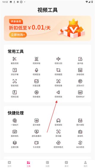 2、進(jìn)入視頻工具的頁面內(nèi),找到并點(diǎn)擊視頻倒放的功能按鈕。