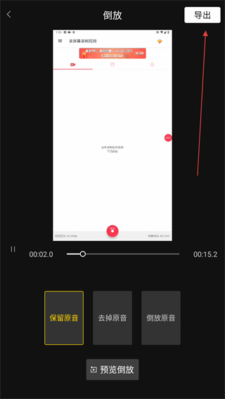 4、在倒放的頁面內(nèi),選擇保留原音后點(diǎn)擊右上角導(dǎo)出的按鈕。
