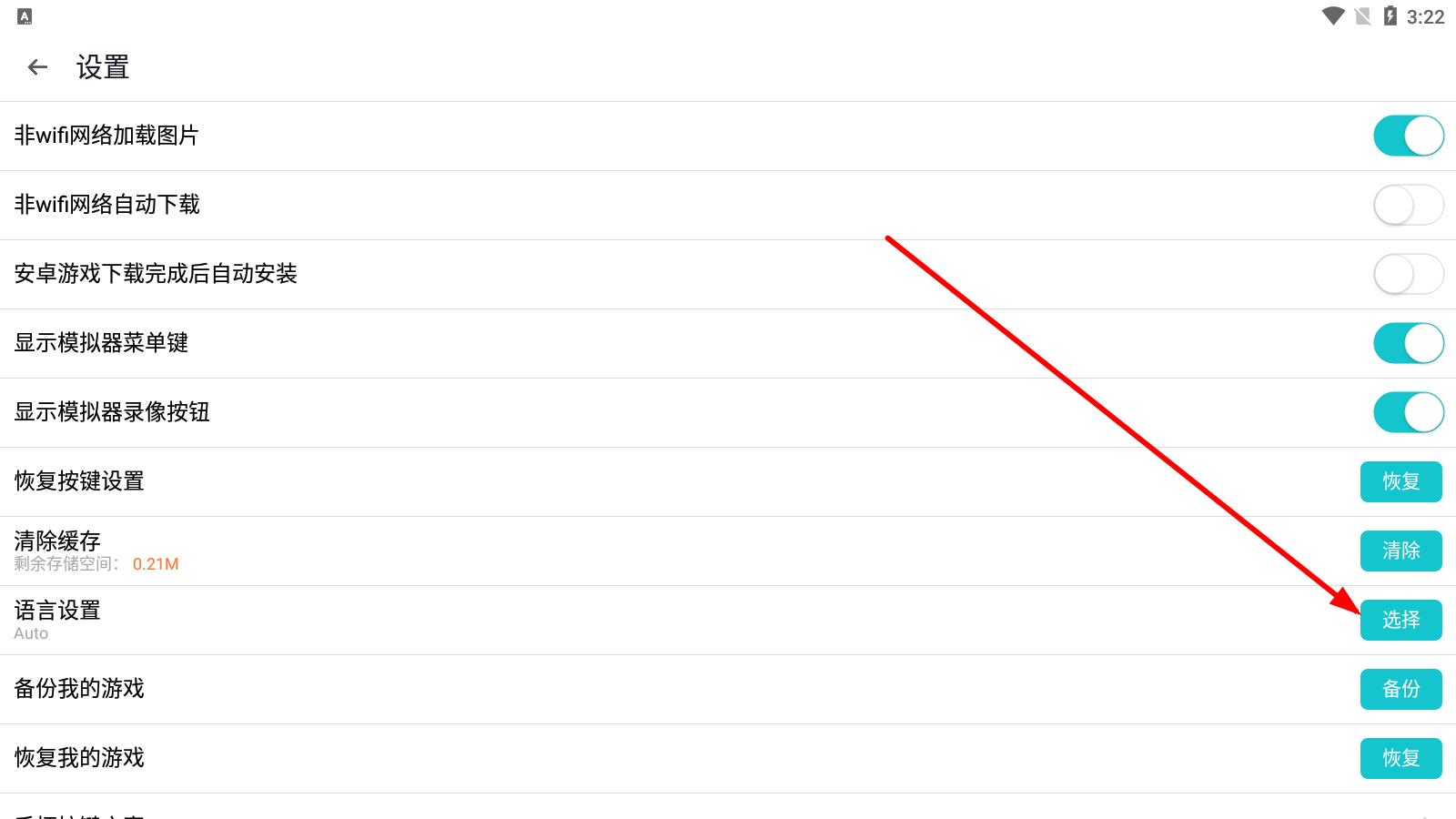 3、進(jìn)入設(shè)置界面后,下滑找到語(yǔ)言設(shè)置,點(diǎn)擊其右側(cè)的選擇按鈕。