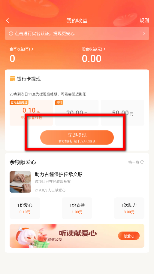 3、在我的收益頁(yè)面,確認(rèn)收益金額滿(mǎn)足提現(xiàn)條件后,點(diǎn)擊立即提現(xiàn)按鈕,按照提示完成提現(xiàn)操作。