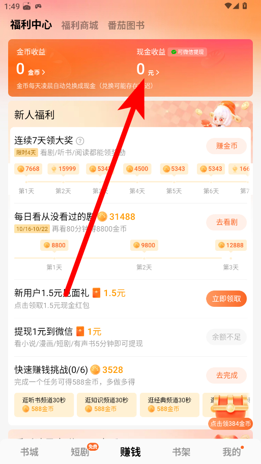 1、打開(kāi)番茄免費(fèi)小說(shuō)APP,點(diǎn)擊底部導(dǎo)航欄中的賺錢(qián)選項(xiàng),進(jìn)入福利中心頁(yè)面。