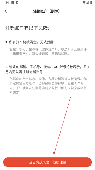 3、在注銷(xiāo)賬戶(hù)風(fēng)險(xiǎn)提示頁(yè)面,確認(rèn)后點(diǎn)擊我已確認(rèn)風(fēng)險(xiǎn),繼續(xù)注銷(xiāo)按鈕。