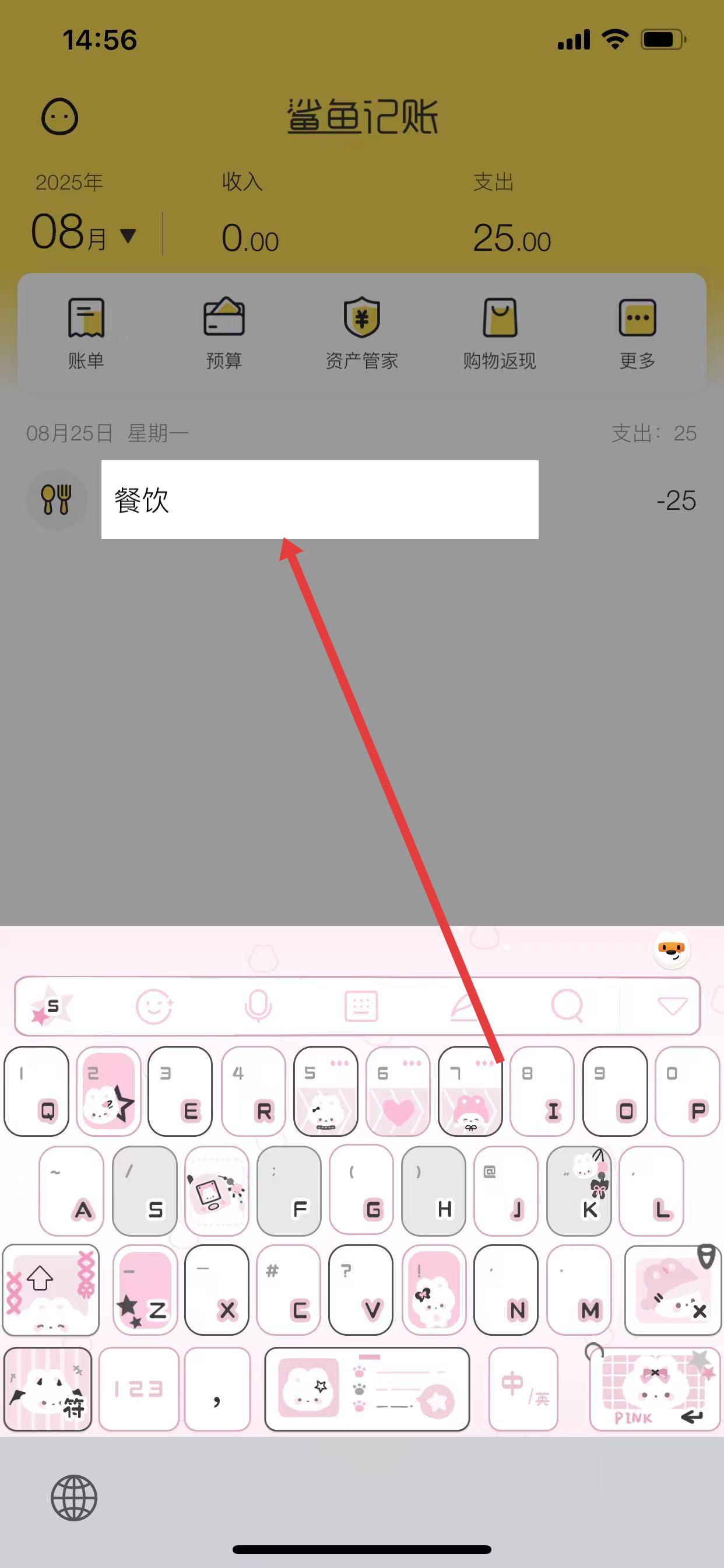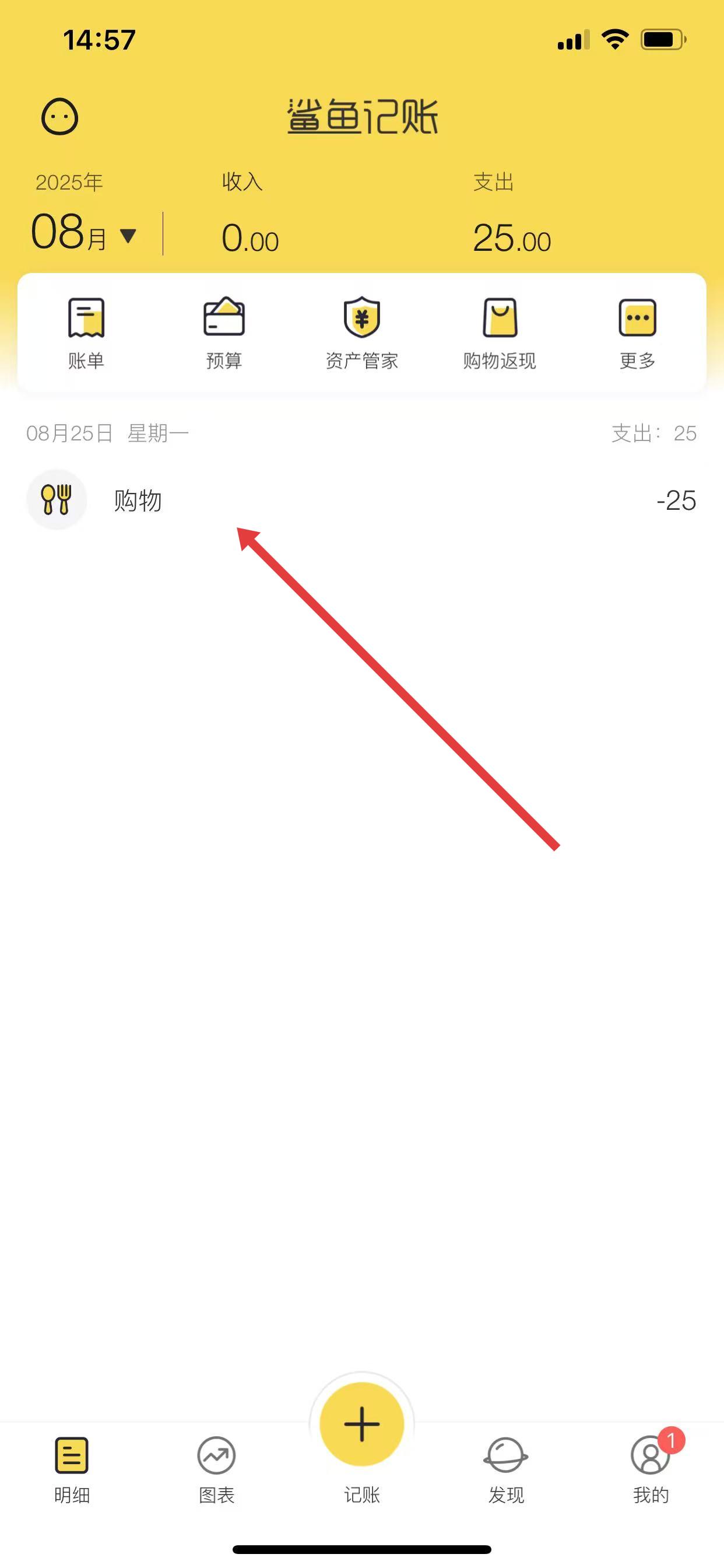 1、打開鯊魚記賬APP,修改記賬的類目,如把餐飲改成購物。