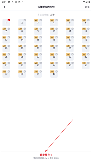 4、在選擇緩存視頻的頁面內(nèi),選擇集數(shù)后再點擊確定緩存即可。