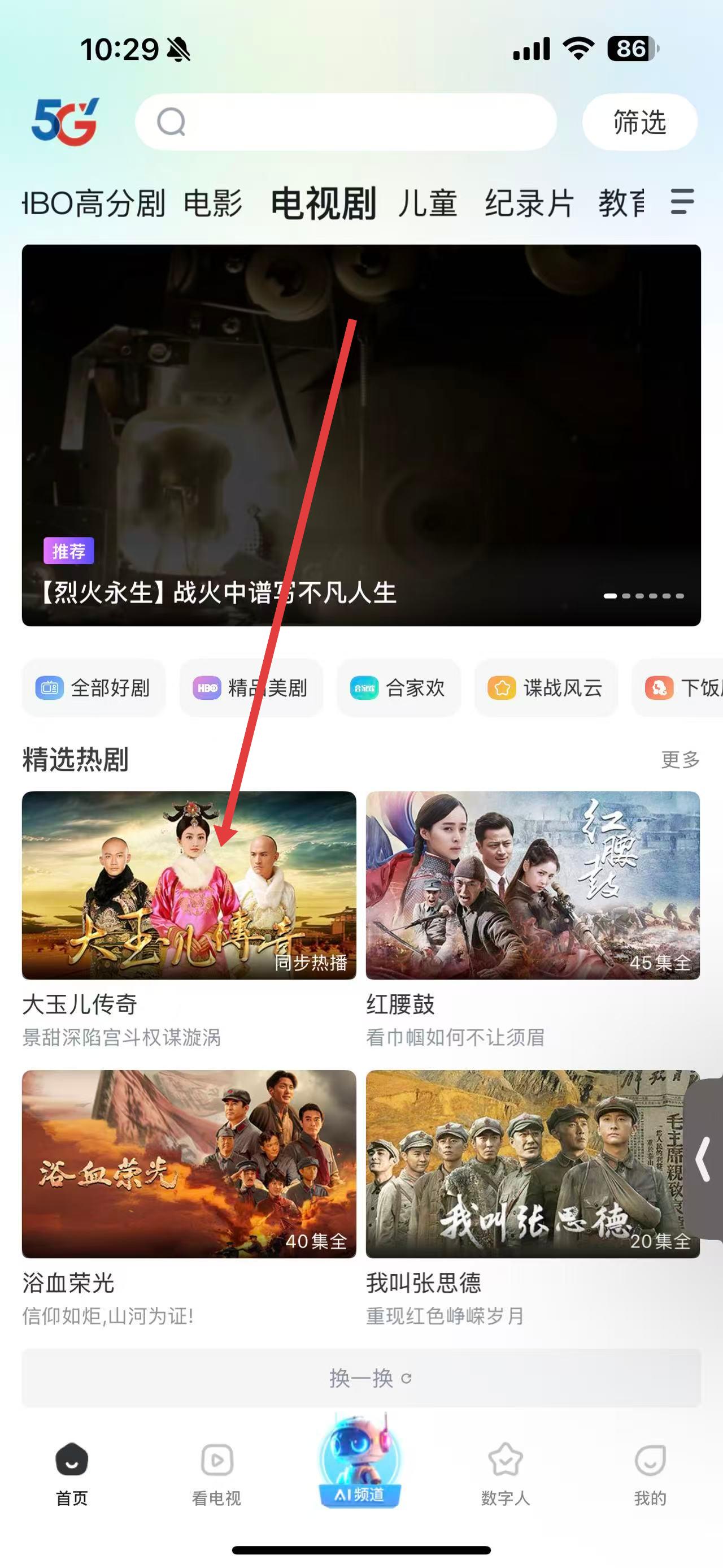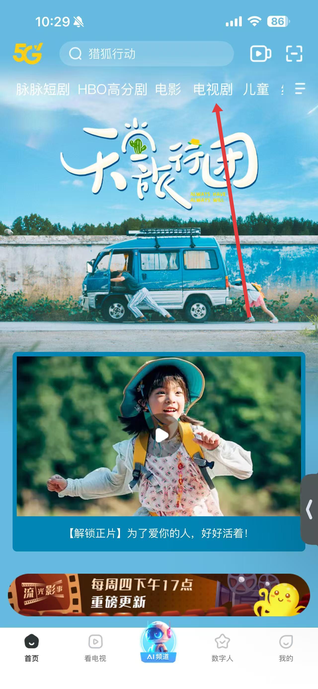 1、進(jìn)入天翼超高清APP,進(jìn)入首頁,選擇點(diǎn)擊電視劇。