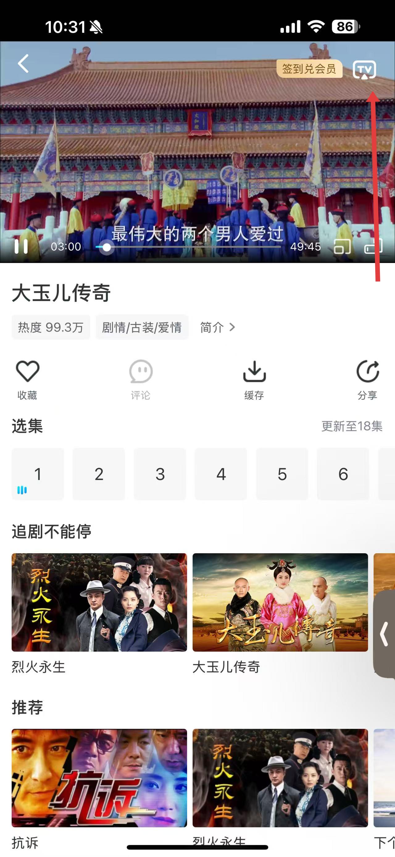 3、選擇好影視進(jìn)入影片觀看,選擇上方TV按鍵。