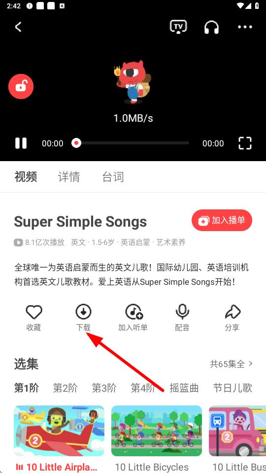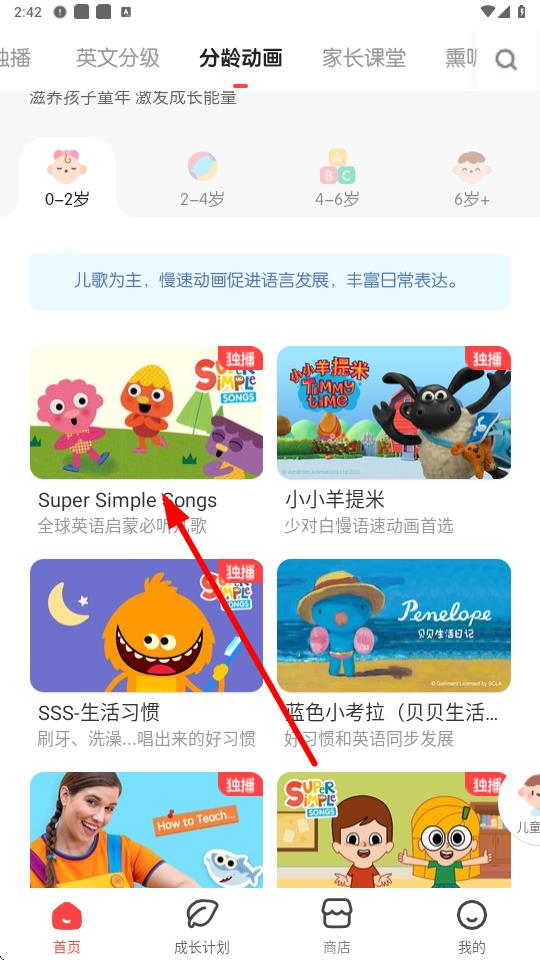 1、打開(kāi)小小優(yōu)趣APP,在首頁(yè)或分類頁(yè)面找到想要下載的動(dòng)畫,比如點(diǎn)擊Super Simple Songs。