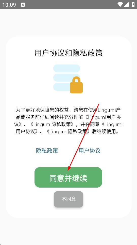 1、打開Lingumi應(yīng)用,在彈出的用戶協(xié)議和隱私政策頁(yè)面,點(diǎn)擊同意并繼續(xù)。