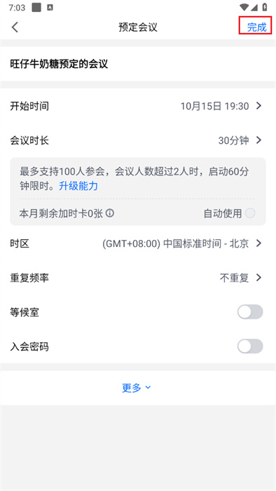 3、可以在常規(guī)會議欄進行各項不同信息的選擇,還可以點擊【更多】按鈕,來進一步的完善會議的規(guī)則要求;