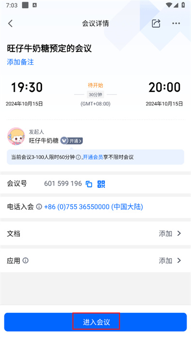 6、最后只需要在會議的時間點擊【進入會議】按鈕,即可開啟會議。