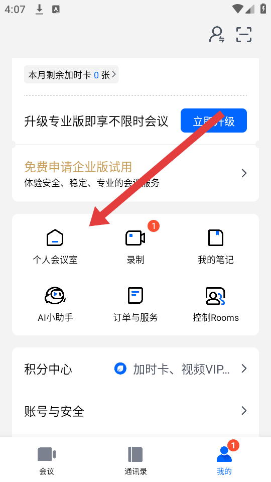 1、若為參會學生,需向會議主持人申請錄制權限,若自行發(fā)起會議,進入個人會議室開會議,默認擁有錄制權限。
