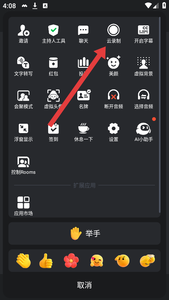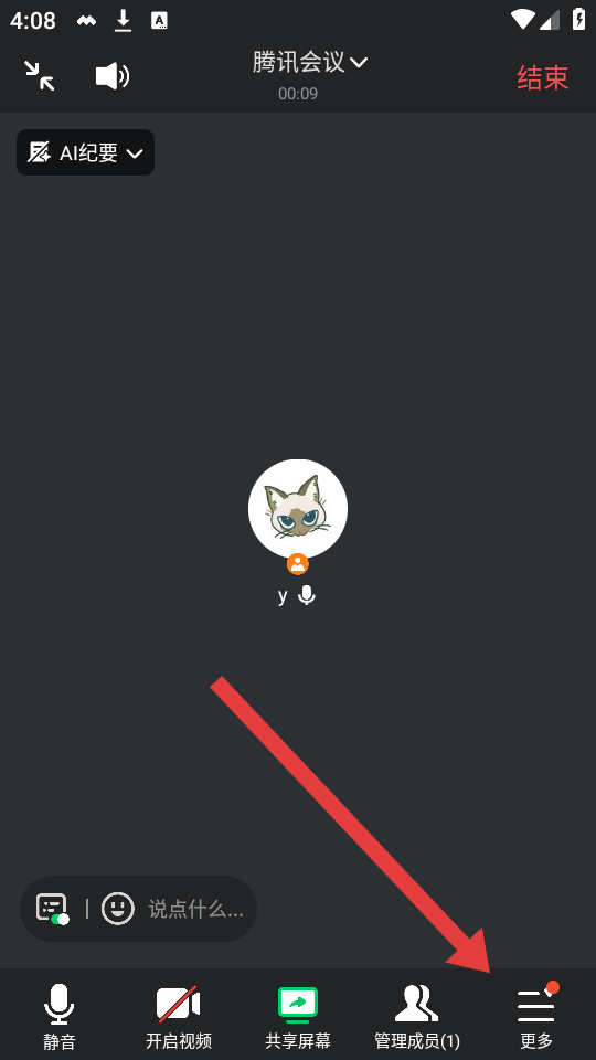 2、進入會議界面后,點擊底部工具欄的更多,展開功能菜單,查看是否顯示云錄制或本地錄制選項。