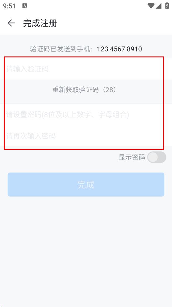 4、在完成注冊頁面,輸入驗證碼,設(shè)置并再次輸入密碼,點擊完成即可完成注冊。
