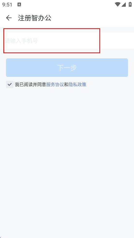 3、在注冊智辦公頁面,輸入手機(jī)號,勾選已閱讀并同意相關(guān)協(xié)議,點擊下一步,進(jìn)入完成注冊頁面。
