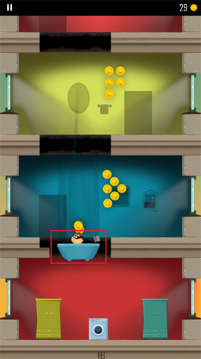 筆者非常喜歡看到浴缸就跳下去,因為跳進浴缸就會和浴缸一起往下掉好幾層樓,除了安全之外,就是超強的破壞力和更多的金幣!而且只要能越往下面的樓層邁進,分?jǐn)?shù)就會愈高,經(jīng)驗值也會愈多。