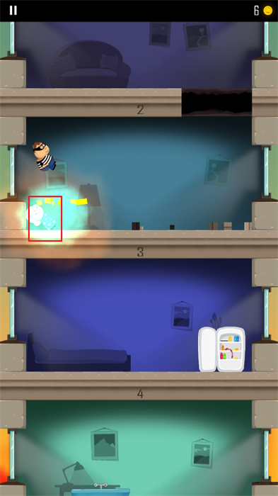 游戲的畫面非常簡單而且可愛。注意到冰箱,冰箱可以讓你擁有短時間內(nèi)無敵的效果!如果準(zhǔn)備好要往下跳了,就在畫面上往下?lián)軇?。可千萬不要忘記拿走所有金幣了!另外你可以踩壞(破壞)家具等等物件來獲得金幣!