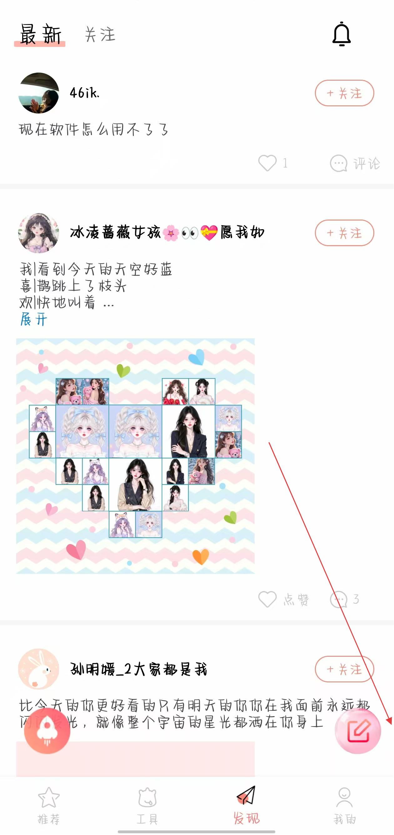2、在發(fā)現(xiàn)頁面,點擊右下角的發(fā)布按鈕,進(jìn)入動態(tài)編輯頁面。